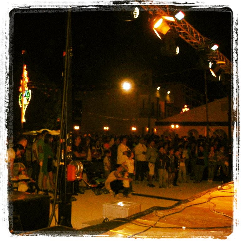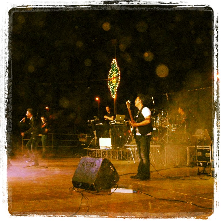 Auf diesem Fußballplatz fand am letzten Sonntag nach dem Feuerwerk sogar ein Konzert statt. Aufgetreten ist in Gestalt der Modà Tribute Band “Modàndo“ eine Lokalberühmtheit, in der Luigis Cousin Pierpaolo Gitarre spielt. Von 22 Uhr bis Mitternacht rockten sie den Kirchenplatz und, da die Originalband „Modà” mit ihrem Schmuserock ziemlich erfolgreich ist und die Schulkinder bereits Ferien haben, war die Party auch bis zum Schluss mit Kindern, Jugendlichen und Eltern gut besucht. Die Anwohner haben es sich mit Freunden und Verwandten auf ihren Balkons und in den Vorgärten bequem gemacht und von dort aus zugehört. Für das leibliche Wohl sorgten Gemeindemitglieder, die grillten, frittierten, Brötchen schmierten und Crepes buken. An diesem fröhlichen Abend konnte ich sehen, was Menschen dazu bringt, sich in einem Verein zu engagieren, den ich eigentlich immer für konservativ und langweilig gehalten habe. Wieder ‚was gelernt.