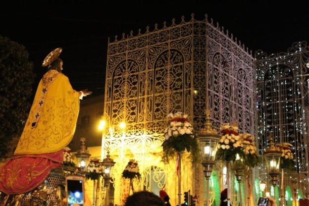 San Nicola 6 Lichterdom seitlichSo wurde auch in diesem Jahr das Privileg, die Statue des Heiligen Nikolaus am 7. Mai hinaus aufs Wasser zu fahren, unter den baresischen Fischern versteigert. Der glückliche Gewinner schmückte sein Boot mit bunten Wimpeln und durfte eine Nacht mit dem Heiligen an Bord auf dem Meer verbringen. Der historische Festumzug bildete am Abend einen zweiten Höhepunkt der Feierlichkeiten. Am 8. Mai landete San Nicola wieder im Hafen an und wurde mit einer fröhlichen Blasmusikprozession in den Lichterdom auf die Piazza Ferrarese getragen.
