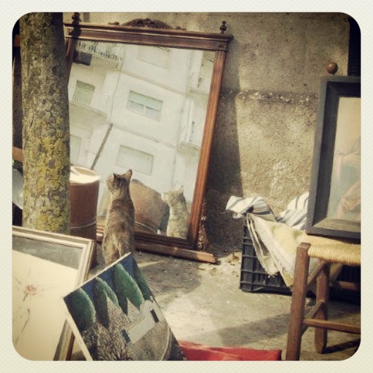 Am zweiten Sonntag eines jeden Monats gibt es einen großen Flohmarkt rund um sowie im Stadtgarten von Ostuni, der weißen Urlaubshochburg Apuliens. Ob die Katze mit dem melancholischen Blick den Spiegel erstanden hat, ist mir nicht bekannt. Soweit ich sehen konnte, hatte sie auch gar keine Mäuse dabei.