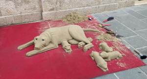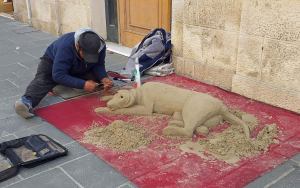 Seit ein paar Tagen hat sich ein Straßenkünstler vor meiner Schule häuslich eingerichtet. Als ich am Montag um die Ecke der Via Principe Amedeo/ Via Sparano im Herzen von Bari bog, da hielt ich den liegenden Hund tatsächlich von weitem für einen Labrador. Erst beim Näherkommen bemerkte ich, dass es sich dabei um einen Haufen Sand handelte. Zugegeben um einen Haufen wirklich erstaunlich bearbeiteten Sandes. Wahrscheinlich vom nahegelegenen Strand „Pane e Pomodoro“.