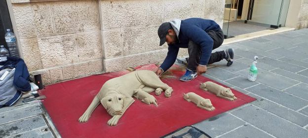 Gestern entstand eine neue Hundefamilie an gleicher Stelle und, wenn man sich in Süditalien zweimal trifft, dann entspannt sich unwillkürlich eine Unterhaltung. Auch wenn Georgi aus Rumänien kommt und nur rudimentär Italienisch spricht, erfuhr ich doch, dass es ihn wegen des besseren Wetters aus Mailand nach Bari getrieben hat. Auch wären die Menschen hier freigibiger zu Straßenkünstlern.