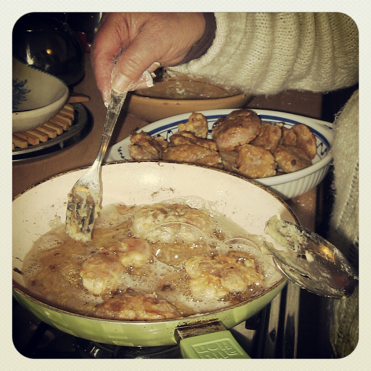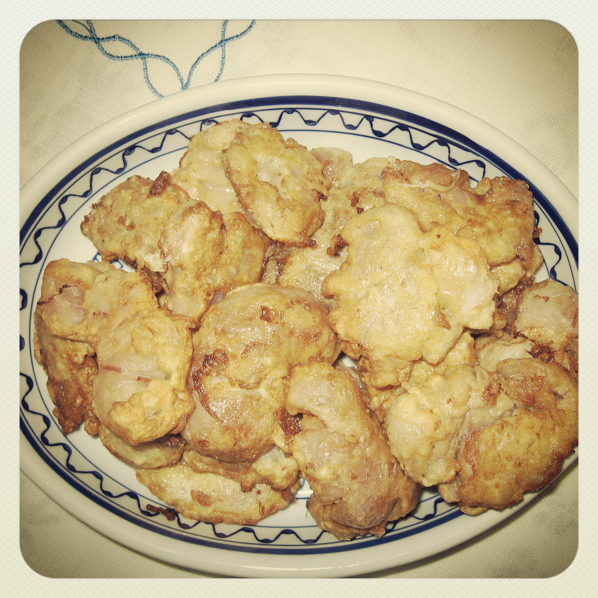 Zum Frittieren werden die abgetropften Zwiebeln zunächst in einem mit einem Schuss Milch und IMG_20130221_140500einer Prise Salz aufgeschlagenem Ei und anschließend in etwas Mehl gewendete. Da Maria meinte, man müsse sie warm essen, schnappte ich mir nach kurzem Abkühlen sofort das erste platte