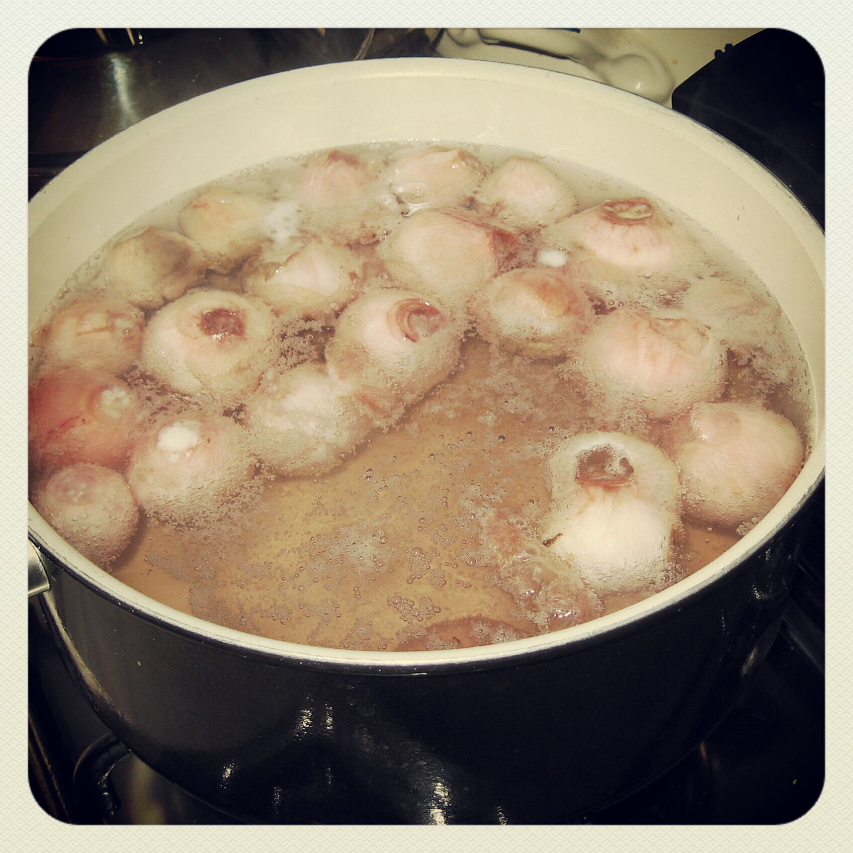 IMG_20130221_140649Aktuell findet man Lampascioni für unter drei Euro das Kilo auf den Märkten und auch in den Gemüseläden – nicht zu vergessen das halbe Kilo, das in Marias Kochtopf seiner Verarbeitung harrte. Heute früh wurden die eingeweichten Zwiebeln komplett von ihrer braunen Haut, den Trieben und den Wurzeln befreit. Dabei kam ihre leicht violett-rosa Färbung zum Vorschein. Dann schnitt Maria die Lampascioni von unten kreuzförmig ein und ließ sie eine halbe Stunde lang kochen. Das Einschneiden hat den Vorteil, dass beim Kochen die Bitterstoffe besser austreten können. Da Maria und Pasquale Lampaschoni am liebsten frittiert essen, dient das Einschneiden aber auch dazu, die Zwiebeln nach dem Kochen platt drücken zu können, so dass sie sich leichter frittieren lassen.