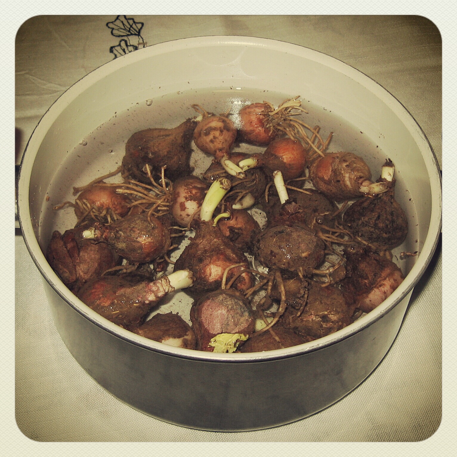 IMG_20130221_140822Nachdem ich die sandigen braunen Dinger fotografisch festgehalten hatte, schüttete Maria sie sofort in einen Topf mit Wasser, in dem sie den restlichen Tag und die folgende Nacht verbringen sollten. „Damit sie weich und weniger bitter werden.“ – wie ich erfuhr. Während also die Zwiebelchen in ihrem Topf vor sich hin weichten, zog ich Wikipedia zu Rate und fand heraus, dass es sich tatsächlich um Blumenzwiebeln handelte. „Lampascioni“ (Muscari comosum) sind demnach eine wilde Hyazinthenart, deren Zwiebeln reich an Mineralsalzen sowie typisch für die traditionelle Küche Apuliens und Basilikatas sind. Während sie in Süditalien als Leckerei gelten und je nach Region einen leicht abgewandelten Namen tragen (z.B. auch Pampasciuni, Bambascioni, Lambascioni), sind sie im restlichen Italien eher unbekannt oder werden zumindest nicht regelmäßig verspeist.
