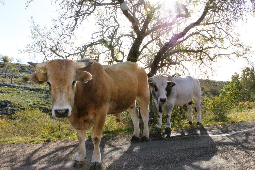 Nachdem wir ca. 2 Kilometer Wald passiert, aber noch keinen Kastanienbaum gesehen hatten, beschlossen wir auszusteigen und ein wenig spazieren zu gehen. Zweifellos waren wir in einem Teil des Foresta Umbra gelandet – einem schattigen Märchenwald mit Unterholz, wilden Veilchen, riesigen Kühen, sowie freilaufenden Ziegen und Schafen. Nur Kastanien gab es zwischen den knorpeligen Kermeseichen keine einzige. Wir vergnügten uns trotzdem und fuhren dann noch tiefer in den Wald hinein bis zu „Casa Natura einem alten Forsthaus, das jetzt in eine B&B mit Restaurant umfunktioniert ist. Im Geiste hörte ich meine Oma sagen: „Hier ist doch der Hund verfroren!“ – was in etwa einen Platz beschreibt, an dem sich Fuchs und Hase Gute Nacht sagen. Wer sich hier einmietet muss sich auf absolute Ruhe und Abgeschiedenheit gefasst machen und muss das Haus auf jeden Fall erreichen, bevor es dunkelt. Handyempfang gab’s im Wald nicht.