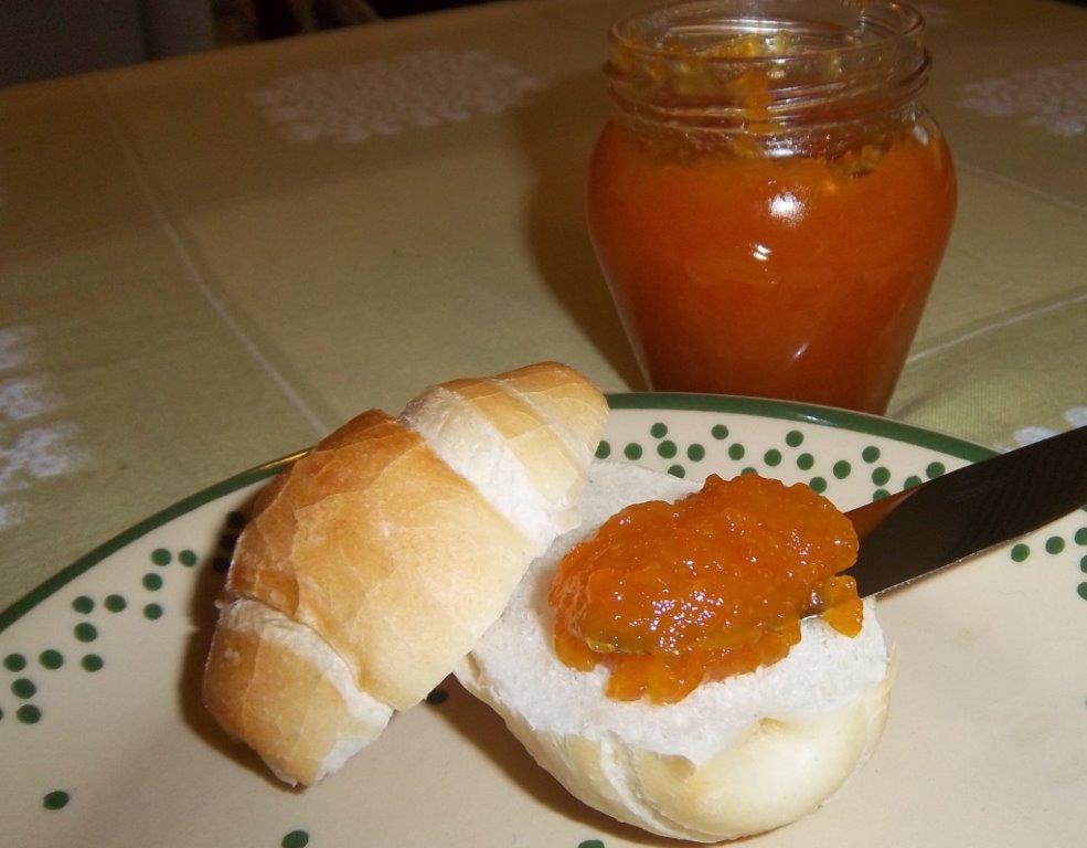 KumquatkorbKumquatmarmeladeMit Gelierfix 2:1 war das auch kein Problem. Die gewaschenen Früchte kann man mit Schale verarbeiten, muss sie allerdings halbieren, um die relativ großen Kerne herauszupulen. Danach waren es nur noch gute 900 g Fruchtmasse. Da die pürierten Früchte jedoch ziemlich musartig waren, gab ich noch den Saft von zwei Orangen und einer Zitrone hinzu. So wurde es eine gut streichbare Marmelade, die mit ihrem leicht bitteren Geschmack einen schönen Kontrast zu süßem Weißbrot bildet. … und die leuchtende Farbe sorgt für gute Laune auf dem Frühstückstisch.