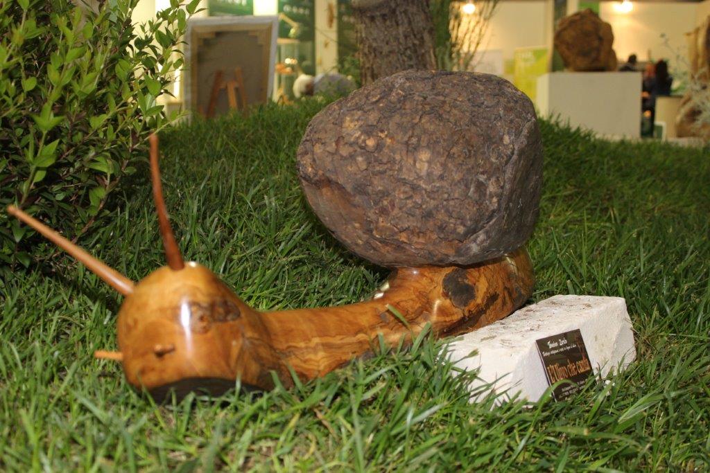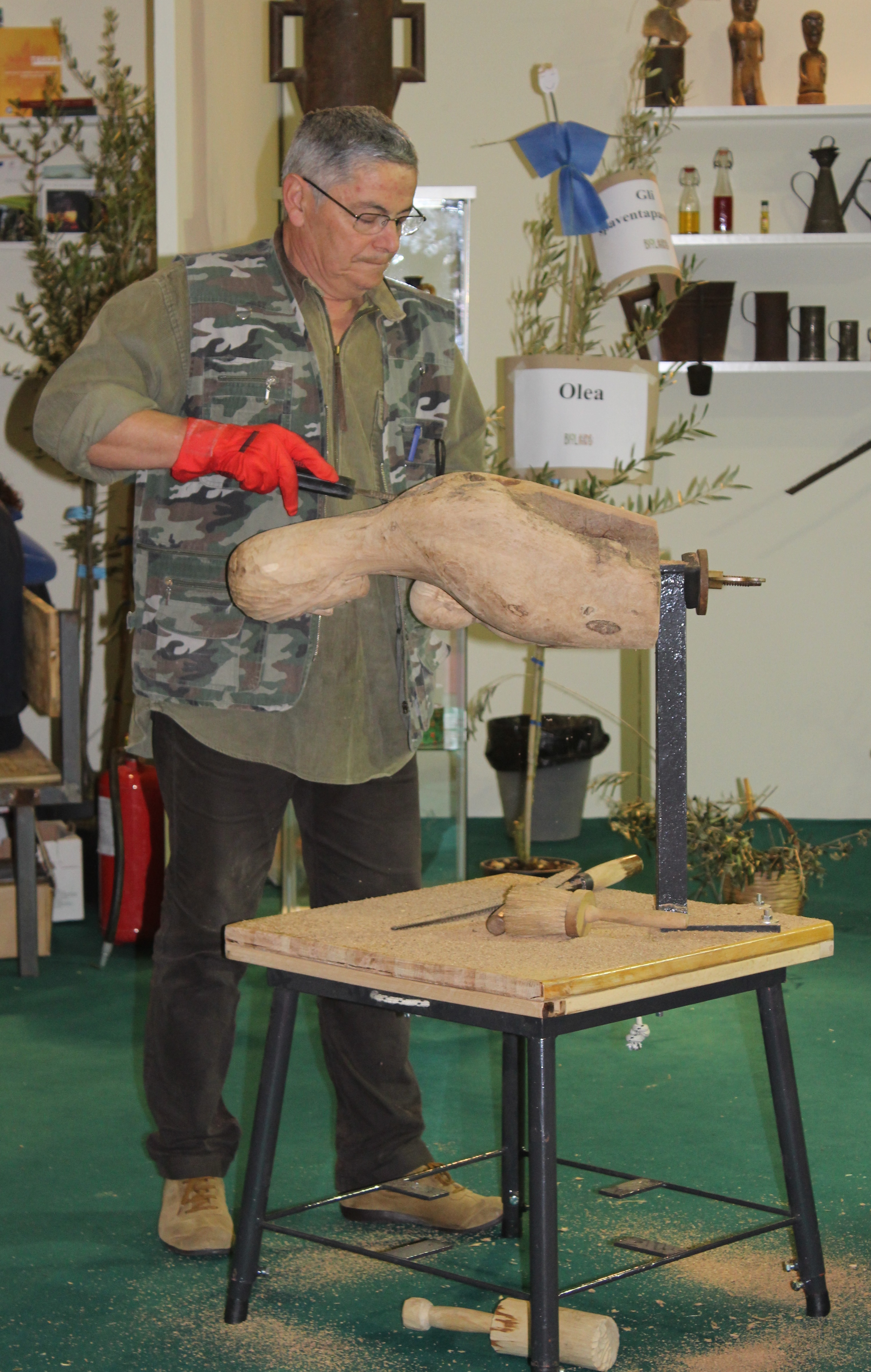 Doch nicht nur die Anbaufirmen haben auf der Oasi Überzeugungsarbeit hinsichtlich der Vielseitigkeit von Oliven geleistet. Auch bildende Künstler der Region zeigten, was sich alles in einem Stück Olivenbaumholz verbergen kann: angefangen bei eher einfachen Formen wie Löffel über Schmuckstücke bis hin zu großformatigen Skulpturen. Von der schweißtreibenden Seite der Kunst konnte man sich beispielsweise überzeugen, als Cosimo Latorre am Sonntagmorgen an einem Stück zu arbeiten begann. Ich traf auch Tonino Zurlo wieder, einen alten Bekannten aus Ostuni, in dessen kleine, versteckte Werkstatt ich immer wieder gern einkehre, obwohl er seine Kunstwerke nur schweren Herzens oder gleich gar nicht verkauft.