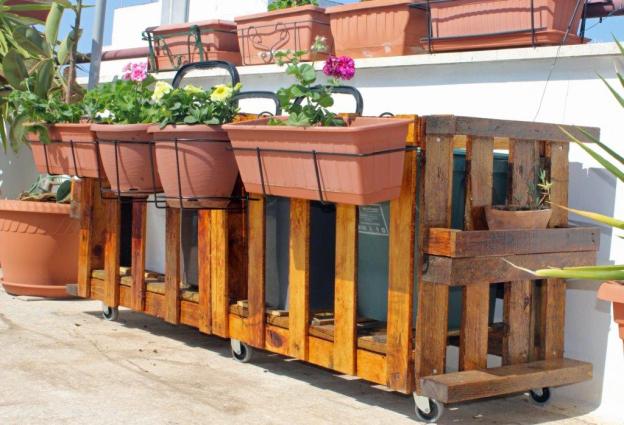 Nach etwas Überlegung beschloss ich, einen Zaun zu bauen, in dem die Mülleimer leicht zugänglich aufbewahrt werden konnten. Irgendwann kam die Idee hinzu, diesen Zaun beweglich zu gestalten und die Mülleimer nicht auf die Erde zu stellen. Eine rollende Mülleimerumzäunung hat den Vorteil, dass man leicht darunter fegen kann. Ich finde, dass ich mal wieder eine genial praktische Idee hatte, und habe auch gleich noch ein paar Blumenkästen daran aufgehängt.