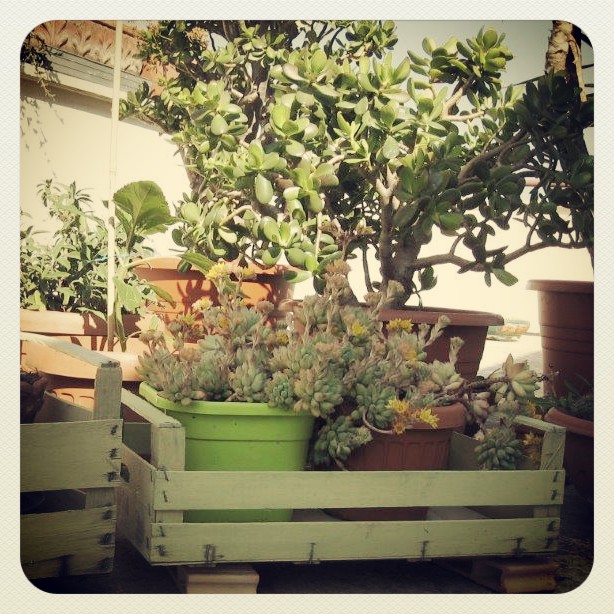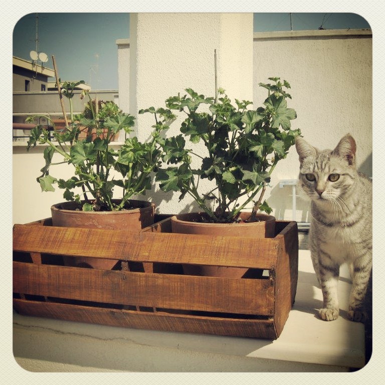 IMG_7077Vor ein paar Wochen sah ich ein besonders schönes Palettenexemplar, das nur halb so groß wie ein normales war, neben einem Müllcontainer vor einem Spielzeuggeschäft im Zentrum von Bari stehen. (Man sieht es auf dem Foto unter den Töpfen hervorlugen.) Ich war auf dem Weg zum Auto, das ich weit entfernt dort parke, wo man keine Parkgebühr von zwei Euro pro Stunde bezahlen muss. Nur kurz wägte ich ab, ob sich das Tragen einer Palette mit einem schwarzen Lehrerinnenkostüm und Pumps vereinbaren ließ. Ihr wisst ja: „bella figura“ und so… . Dann beschloss ich, dass das Tragen von Paletten unbedingt Trend werden sollte, schnappte mir das Teil und hängte es mir lässig in die Armbeuge. Ich gebe zu, es verlangte einiges an Willenskraft so auszusehen, als ob das Holzmonstrum nur so viel wie eine Handtasche wiegen würde, aber hell nussbaumfarben angestrichen, gefällt sie mir gut unter dem Zitronenbäumchen. Dafür hat sich die halbe Stunde schweißtreibendes Trendsetting gelohnt. Bisher habe ich jedoch noch niemanden gesehen, der diese Mode aufgegriffen hätte. Daran muss ich also noch ein bisschen arbeiten.
