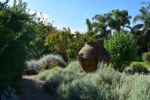 Es gibt mehrere, thematisch unterschiedliche Säle für Feierwillige, Teichanlagen, Gewächshäuser, lauschig versteckte Bänkchen, einen großen Spielplatz für die Kleinen und immer wieder erstaunliche Blicke auf uralte Olivenbäume oder auch traditionelle Aufbewahrungsgefäße für Olivenöl, die (für mich zurecht) wie Kunstwerke im Garten aufgestellt wurden.