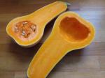 Den kleinen Kürbis halbieren und die Kerne entfernen. Währenddessen den Ofen auf 180 Grad vorheizen und dann den Kürbis ca. eine halbe Stunde darin weich garen lassen. Danach kann das Kürbisfleisch ganz leicht mit einem Löffel ausgeschabt werden.