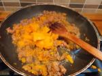 Dann eine Kelle voll Nudelwasser zur Salsiccia in Kürbiscreme geben, um das ganze etwas sauciger zu machen. Nach Belieben mit ein bisschen Sahne andicken und zum Schluss die Nudeln einrühren.