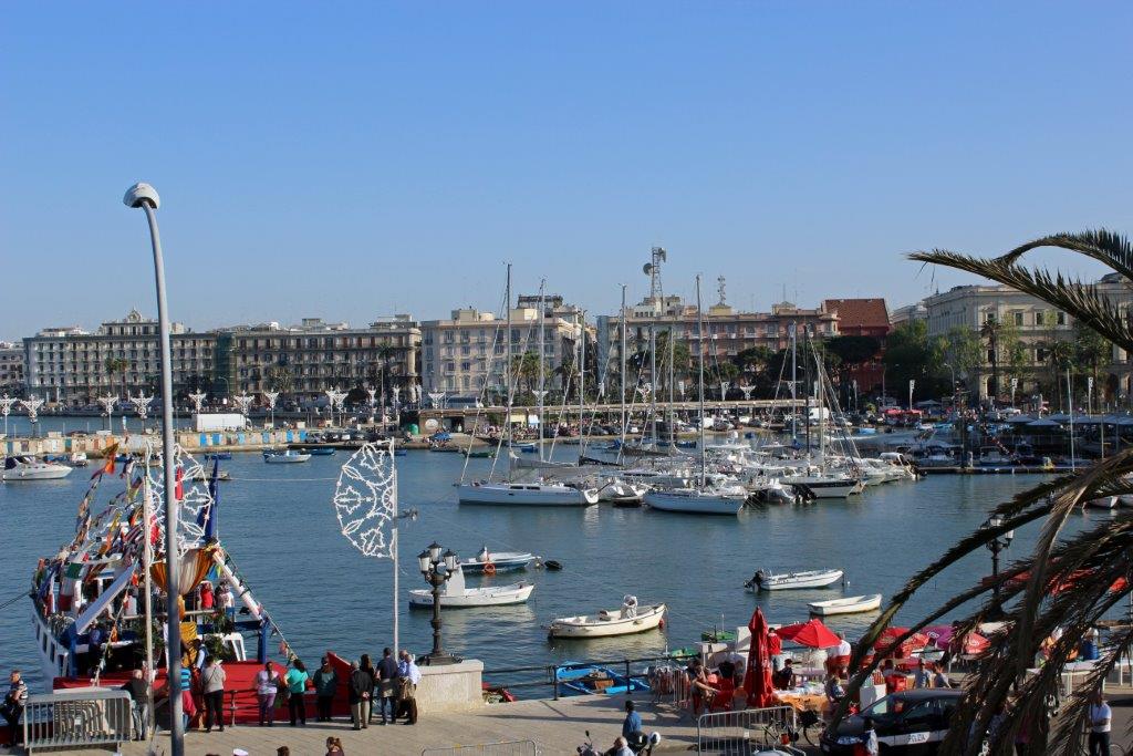 Der Hafen von Bari mit dem geschmückten Fischerboot (l.), welches die Ikone des Heiligen Nikolaus auf das Meer hinausfahren sollte.