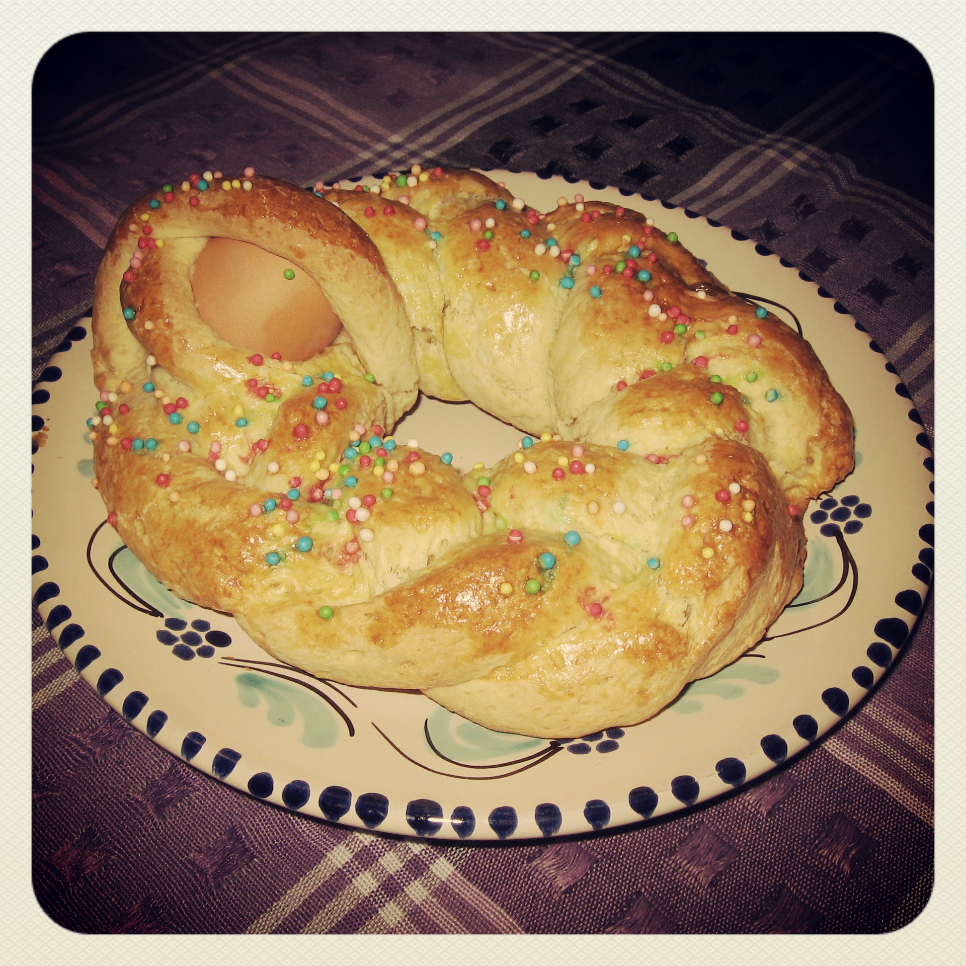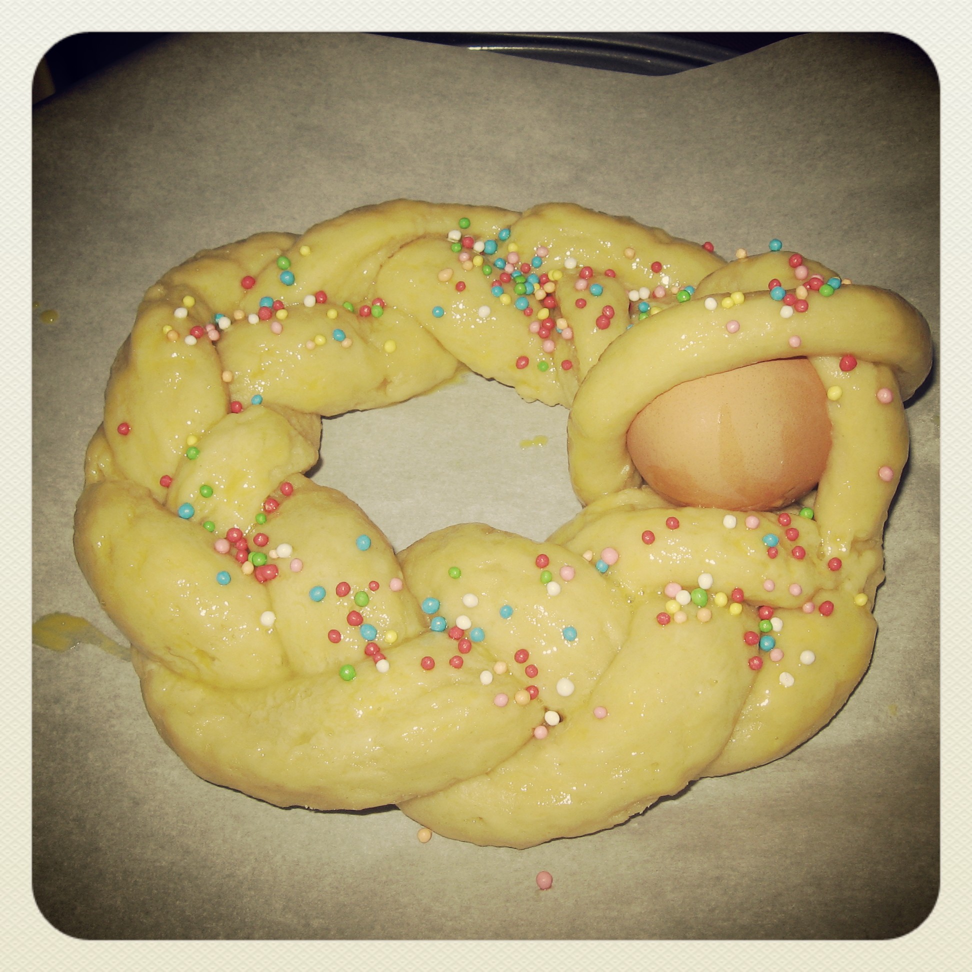 IMG_20130322_205105Aus den drei Teigwürsten flicht man nun einen Zopf, den man anschließend zu einem Ring zusammenlegt. Dort wo die Enden aufeinanderstoßen, kneift man sie etwas zusammen und formt anschließend eine Kuhle, in die das gekochte Ei gelegt wird. Die zwei dünnen Teigrollen werden kreuzförmig über das Ei drapiert und mit dem runden Zopf verbunden. Anschließend bepinselt man das ganze Kunstwerk mit dem aufgeschlagenen Ei, damit es eine schöne braune Farbe erhält, und dekoriert nach Belieben mit bunten Streuseln. Nach ca. 30-40 min bei 180 Grad ist die Scarcella fertig gebacken. Die Kekse haben ca. 15 min gebraucht.