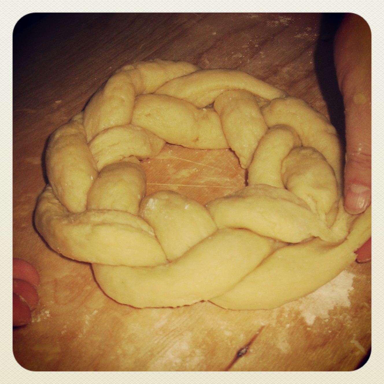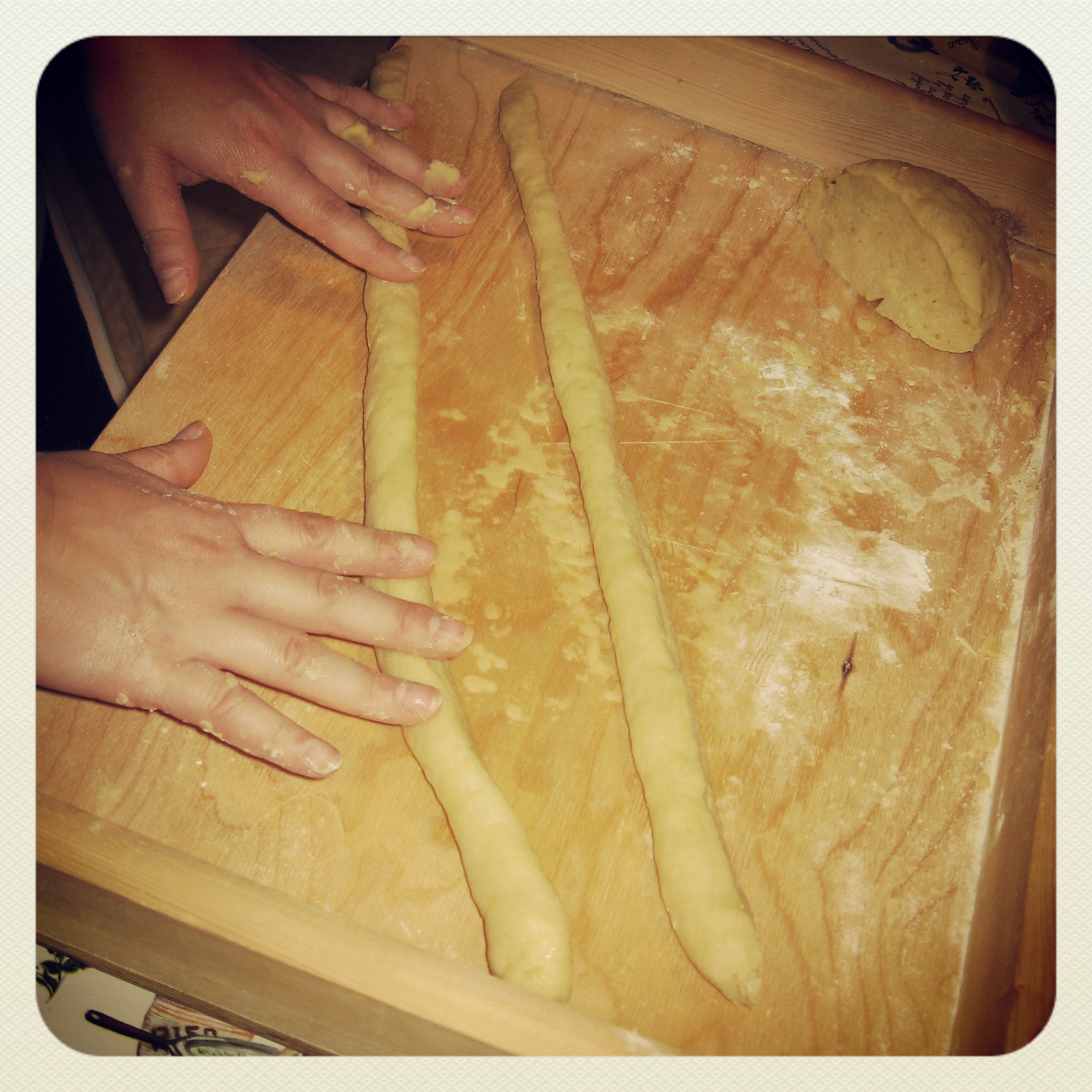 Von diesem nimmt man nun ein kleines Stückchen ab, aus dem man zwei kurze, dünne IMG_20130322_205141Rollen formt, die im Anschluss an die eigentliche Arbeit das Ei auf der Scarcella „festhalten“ werden. Den Rest des Teigs teilt man in drei gleiche Teile und rollt diese zu Teigwürsten von ca. 1-1,5 cm Dicke aus. Ich habe für unsere Scarcella nur 2/3 des Teiges verwendet. Daher ist sie vom Durchmesser 20 cm groß geworden. Aus dem anderen Drittel habe ich Kekse ausgestochen, da ich mit dem Kosten nicht bis zum Wochenende warten wollte.