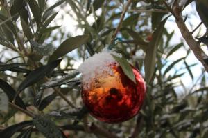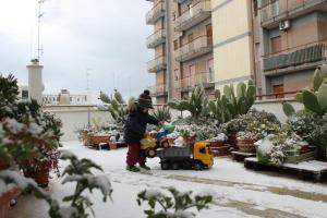 Im letzten Jahr hat mir schon jemand aus dem Ruhrgebiet geschrieben, dass es bei uns in Apulien mehr Schnee zu geben scheint, als in Deutschland. Obwohl ich das natürlich nicht hoffe, da Schnee in und um Bari immer ein totales Chaos bedeutet, dass mit vielen Unfällen, Schließungen von Schulen und Kindergärten und schlitterglatten Fußwegen einhergeht, haben wir den Schnee heute morgen dank der Ferien doch freudig begrüßt – jedenfalls Davide und ich. Der Rest von Triggiano versteckt sich immer noch hinter heruntergelassenen Rollläden. Wer nicht anders konnte hat sich langsam auf den Arbeitsweg gemacht.