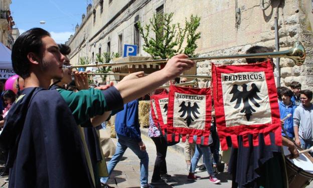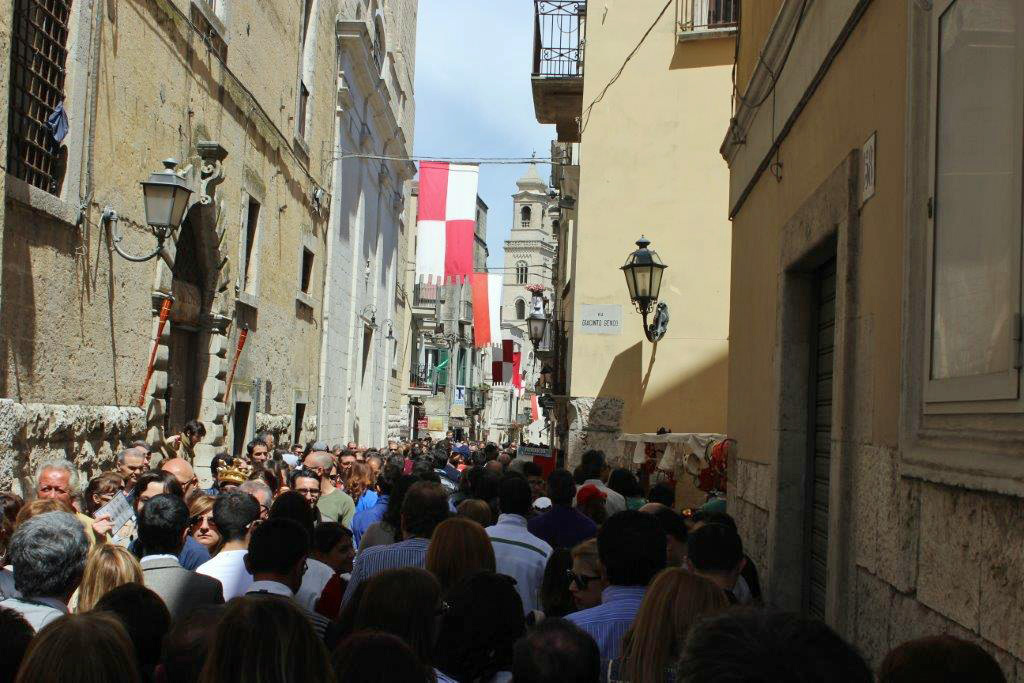 Menschen über Menschen; und wir mittendrin – So könnte man das Federicus-Fest kurz und knapp zusammenfassen, das in Altamura, etwa eine Autostunde von Bari entfernt, in diesem Mai zum vierten Mal veranstaltet wurde. Als wir nach unserem Abstecher zum Pulo und zum Mann von Altamura endlich in der Stadt ankamen, war es Mittag geworden. Auch die restlichen Bewohner der näheren Umgebung hatten sich bis dahin entschlossen, den ersten Mai nicht nur zum Ausschlafen, sondern auch für einen Ausflug zum Mittelalterfest zu nutzen. Auf dem nebenstehenden Foto sollte man in etwa erkennen können, dass es sehr voll war.