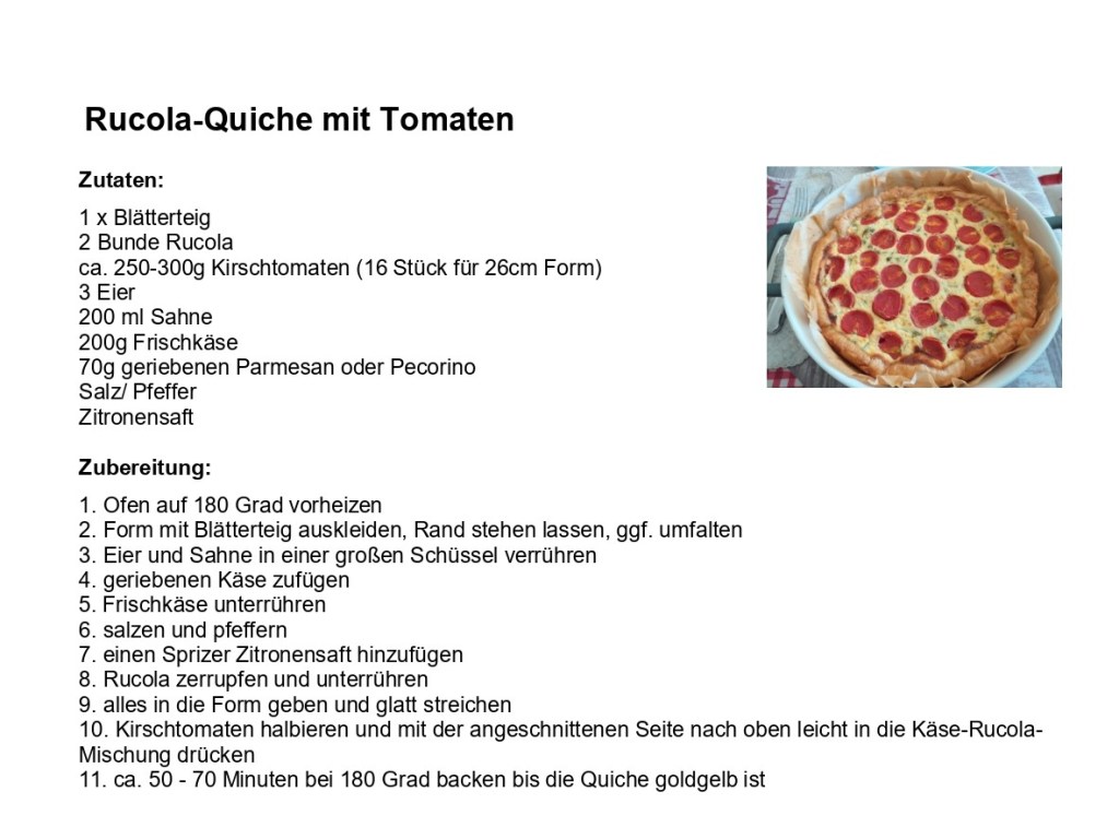 Jedenfalls bekomme ich jetzt nur noch vier recht große Apfeltaschen aus einer Packung Blätterteig. Wegen meines fortgesetzten Lamentierens bedachte mich Luigis experimentierfreudige Cousine Maka, die uns schon so manches leckere Rezept verehrt hat, seit Tante Anna uns wegen ihres krankheitsbedingten Umzugs ins Altenheim nicht mehr als großfamilienversorgende Küchenfee zur Verfügung steht, mit einem Rezept für eine Rucola-Quiche mit Tomaten, bei der ein runder Blätterteig für eine runde Auflaufform ideal ist. Schon kann man nicht mehr meckern.