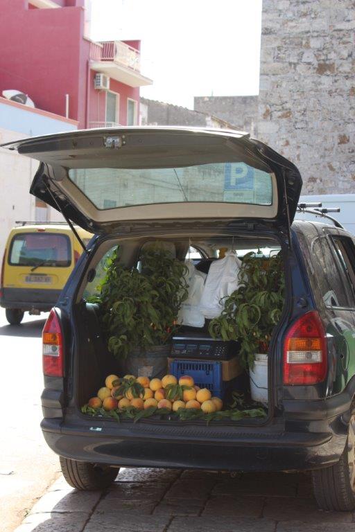 Letztes Wochenende war es dann so weit. Auf nach Turi! Die kleine Stadt mit etwa 13.000 Einwohnern liegt etwa zwanzig Autominuten südöstlich von Bari. Von der SS 100 in Richtung Casamassima aus ist es gut ausgeschildert. Tatsächlich steppt in Turi nur Anfang Juni zum Kirschenfest, der „Sagra della Ciliegia Ferrovia“ der Bär. Dabei handelt es sich um die Feier einer großen, süßen und tiefroten, ja fast schwarzen, Art von Kirschen, die nicht nur hier in Apulien sehr geschätzt werden. Daneben sind die Percochi von Turi ein „Must have“, wenn man die Stadt im Herbst besucht. Wir haben Glück und finden einen geschäftstüchtigen Mitmenschen, der die Ausbeute seines Gartens aus dem Kofferraum hinaus verkauft, und nehmen uns ein Kilo der großen, goldroten Pfirsichart mit ihrem frisch aromatischen Duft nach Spätsommer als Souvenir mit.