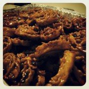 In der letzten Woche hat Maria mich zudem in die Herstellung eines für Apulien typischen Weihnachtsgebäcks eingeweiht. Ich mag besonders die gewöhnliche Variante, die nach dem Ausbacken in Vincotto „gebadet“ und auch damit gefüllt wird. Luigis Familie verwendet dafür einen dicken, fast schwarzen Feigensirup. Vincotto gibt es aber auch etwas heller aus eingekochtem Weintraubenmost. Einen Bericht von der handwerklich etwas aufwendigeren Herstellung dieser klebrigen Süßigkeit namens Cartellate werde ich im Laufe der Woche nachliefern.